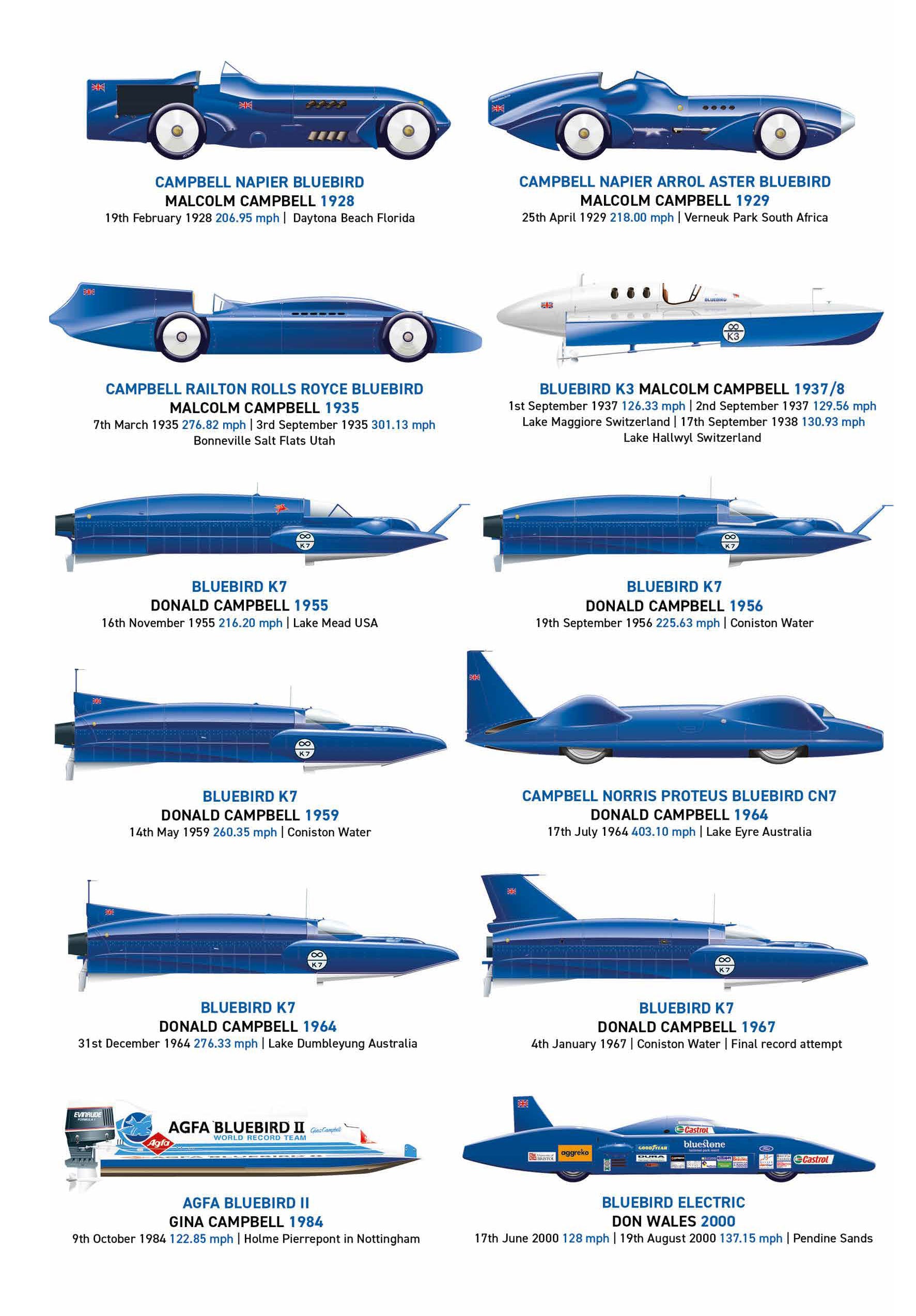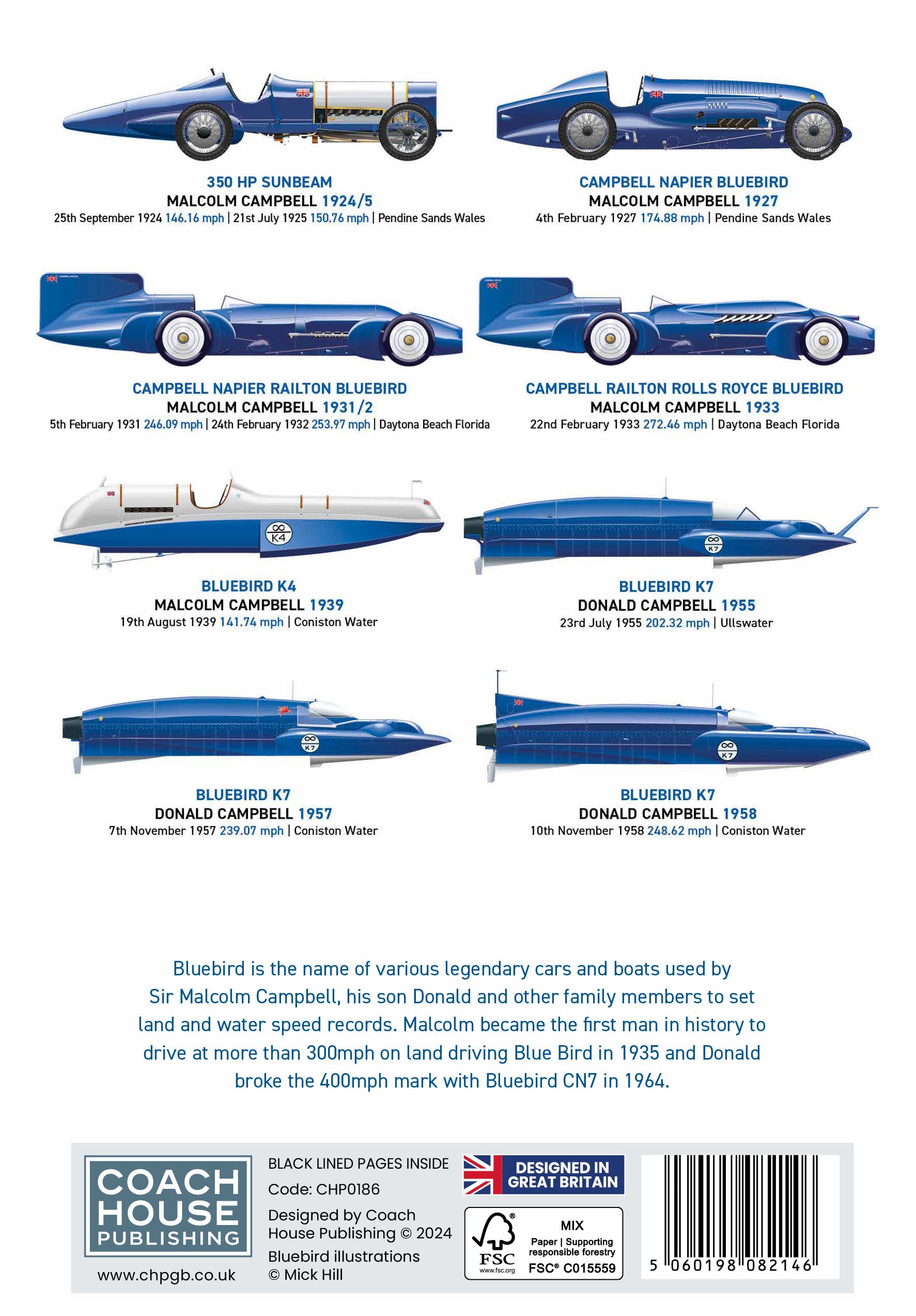 The front and rear cover displays a series of carefully illustrated images of different record-breaking Bluebird cars and boats. The perfect notebook for Bluebird & Transport Enthusiasts around the world!