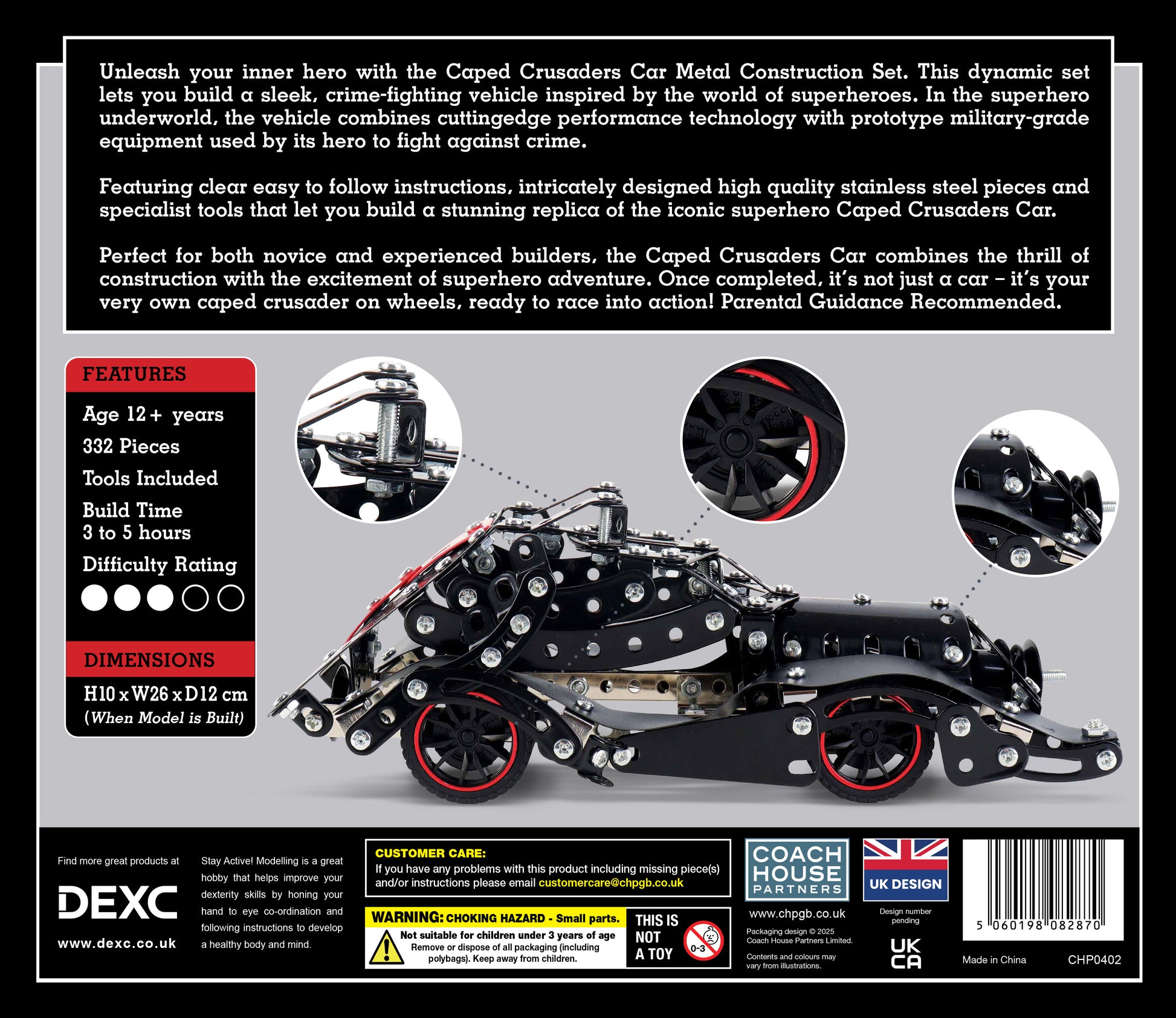 Featuring clear easy to follow instructions, intricately designed high-quality stainless-steel pieces and specialist tools that let you build a stunning replica of the iconic superhero Cape Crusaders Car.
