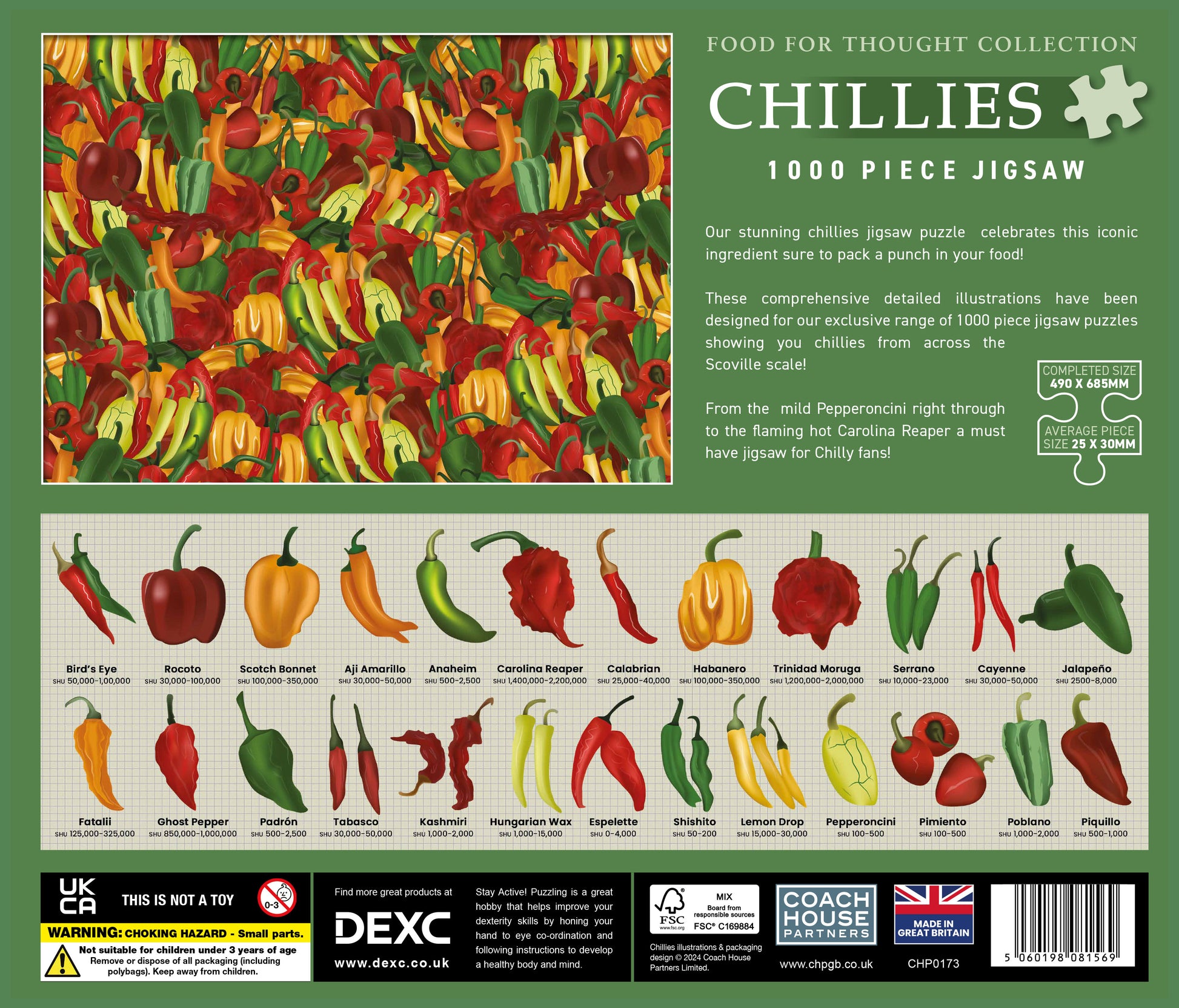 These comprehensive detailed illustrations have been designed for our exclusive range of 1000 piece jigsaw puzzles showing you chillies from across the Scoville scale!