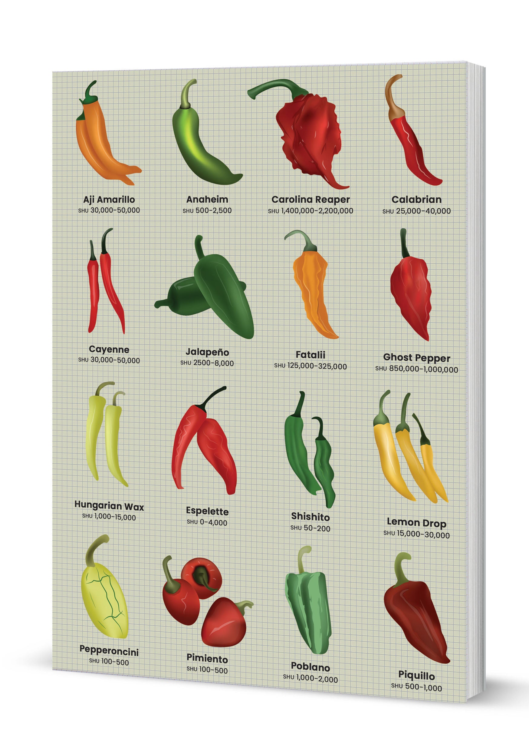 These comprehensive detailed illustrations have been designed for our exclusive range of notebooks showing you chillies from across the Scoville scale!