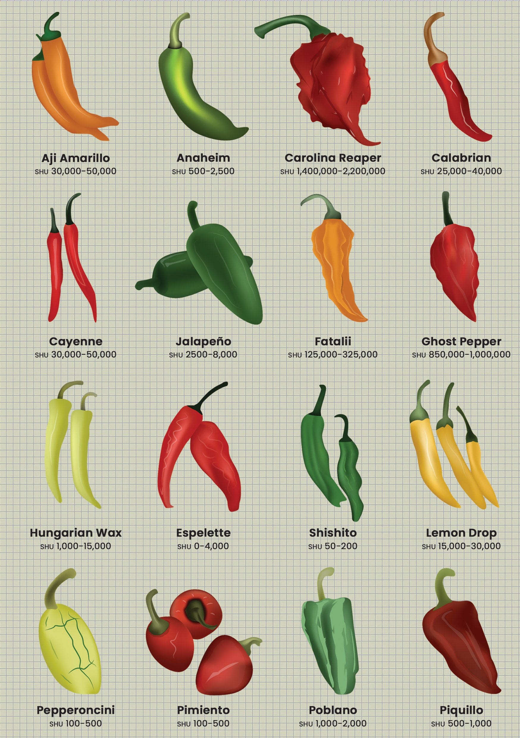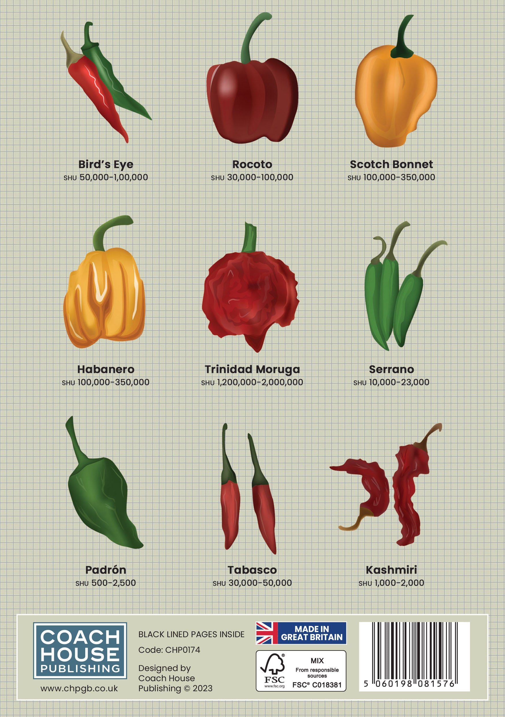 The front and rear cover displays a series of carefully illustrated images from the mild Pepperoncini right through to the flaming hot Carolina Reaper.