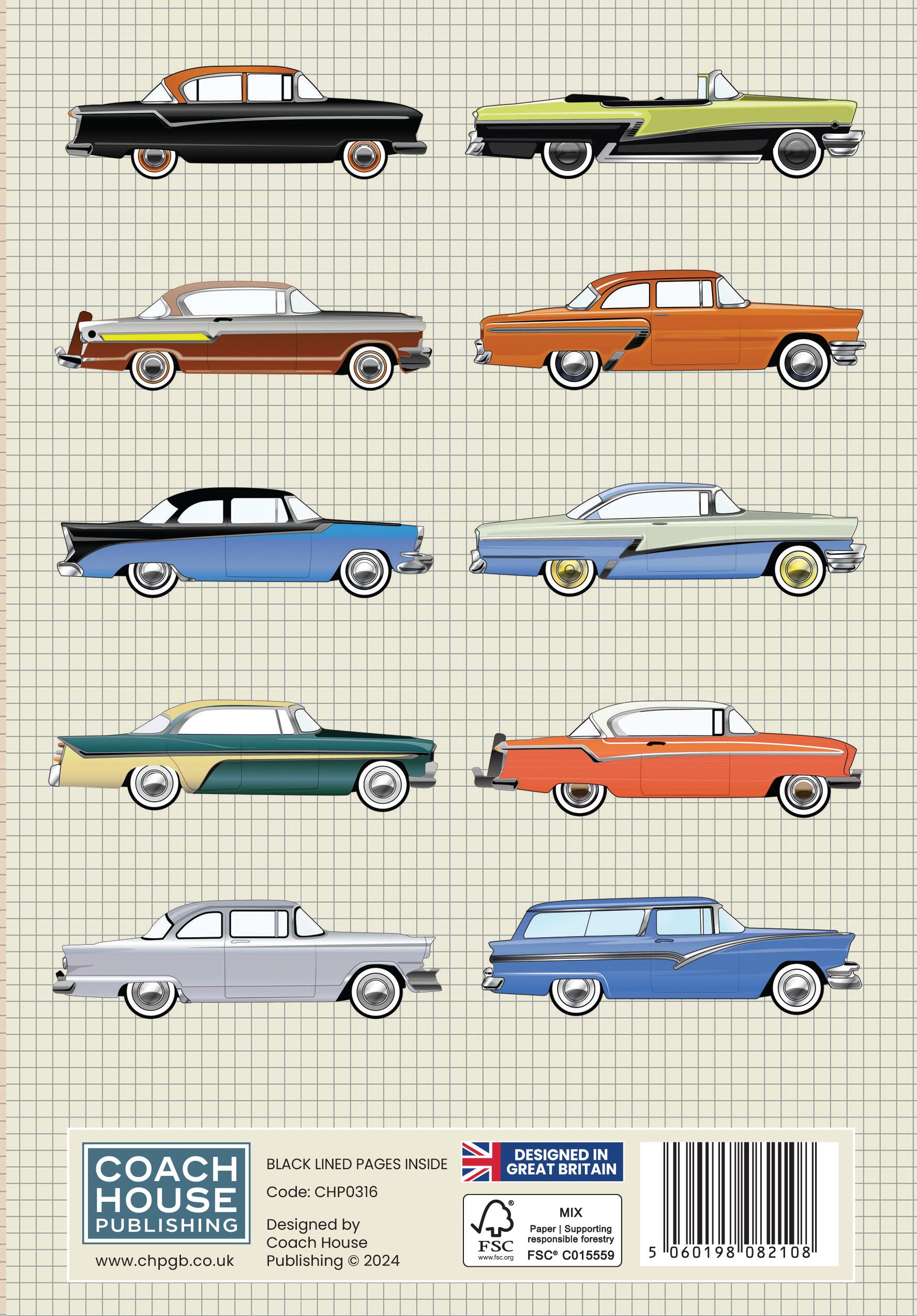 The front and rear cover displays a series of carefully illustrated images of Classic American cars. The perfect notebook for Classic American Car & Transport Enthusiasts around the world!