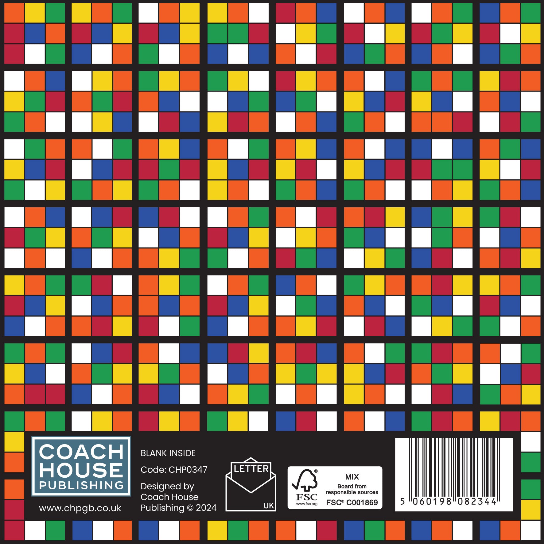 The front and rear cover features the classic white, red, blue, orange, green, and yellow cube squares of a Rubik’s Cube that have been brought to life in this beautiful pattern illustration. A perfect card for Rubik's Cube enthusiasts!