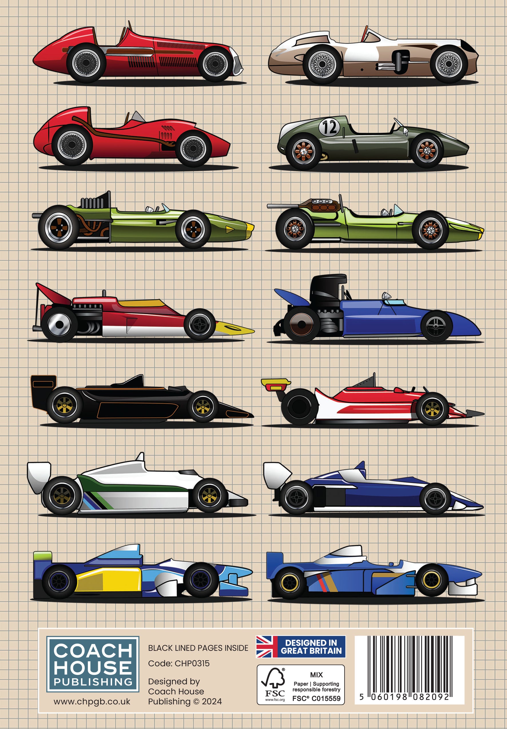 The front and rear cover displays a series of carefully illustrated images of iconic Grand Prix racing cars through the decades. The perfect notebook for Grand Prix Racing Car & Motor Racing enthusiasts around the world!