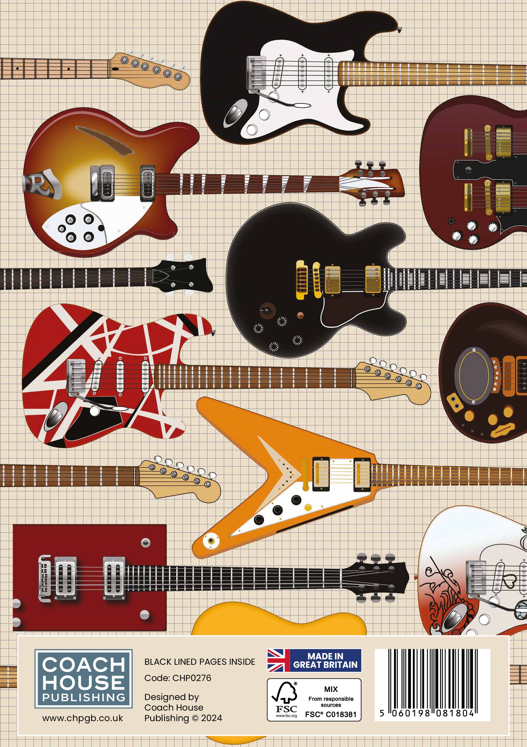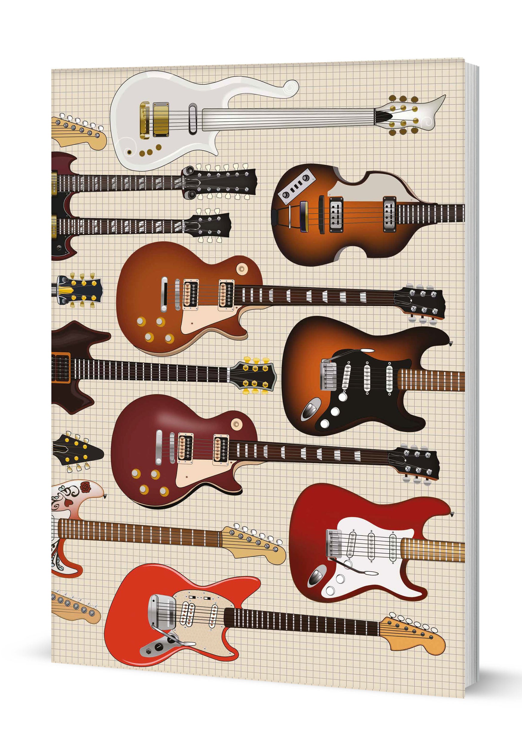 The front and rear cover displays a series of carefully illustrated images of different guitars through the decades. The perfect notebook for Music Enthusiasts around the world!