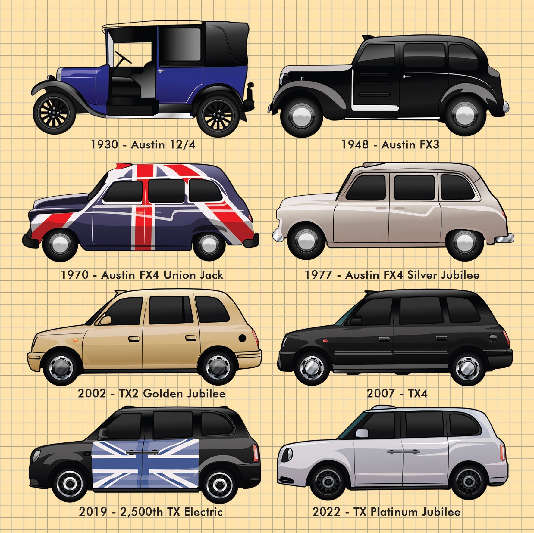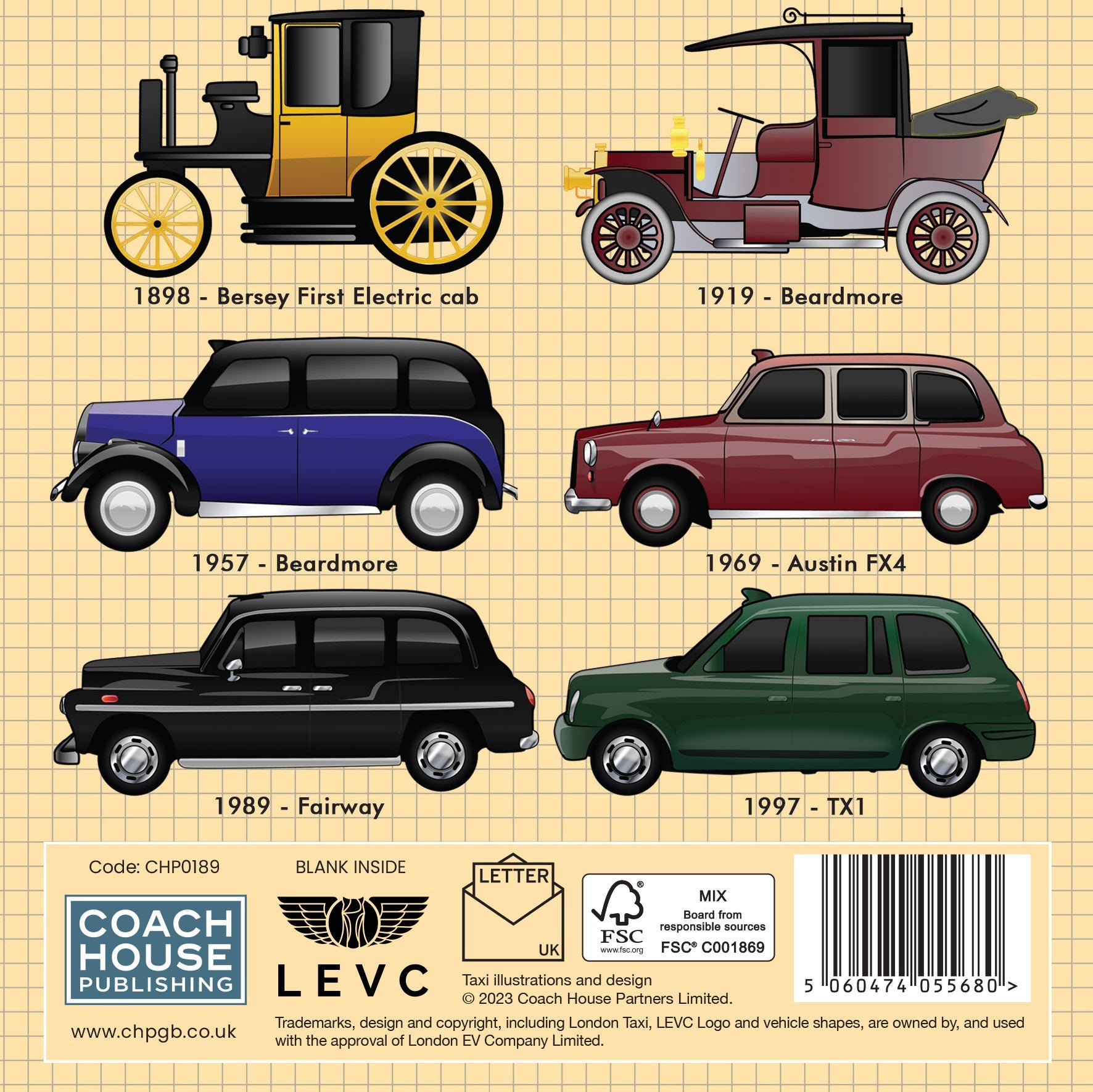 The front and rear cover displays a series of carefully illustrated images of different London Taxis from 1898 through to the modern-day cabs, featuring cars such as the Unic 12/16 and Austin 12/4 right through to the classic Fairway and the modern-day TX Electric. The perfect card for London Taxi & Transport Enthusiasts around the world!