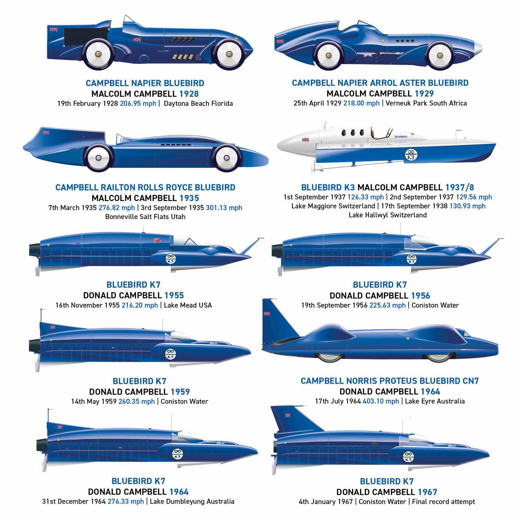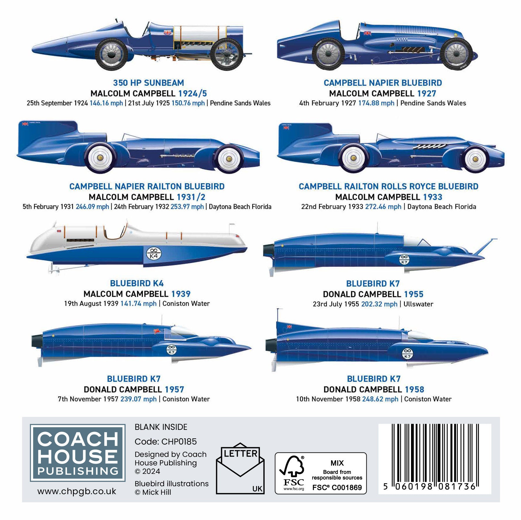 The front and rear cover displays a series of carefully illustrated images of different record-breaking Bluebird cars and boats. The perfect card for Bluebird & Transport Enthusiasts around the world!