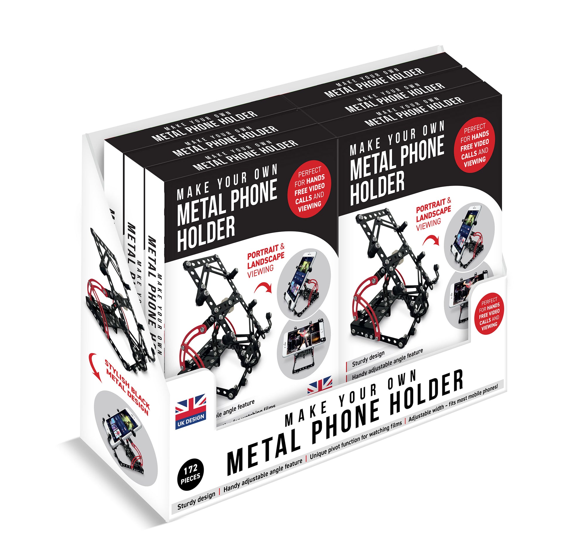 Stock up on a unique, hands-on gift that’s perfect for every occasion. This black counter display unit contains 6 individual Make Your Own Phone Holder metal construction sets, ready for retail.