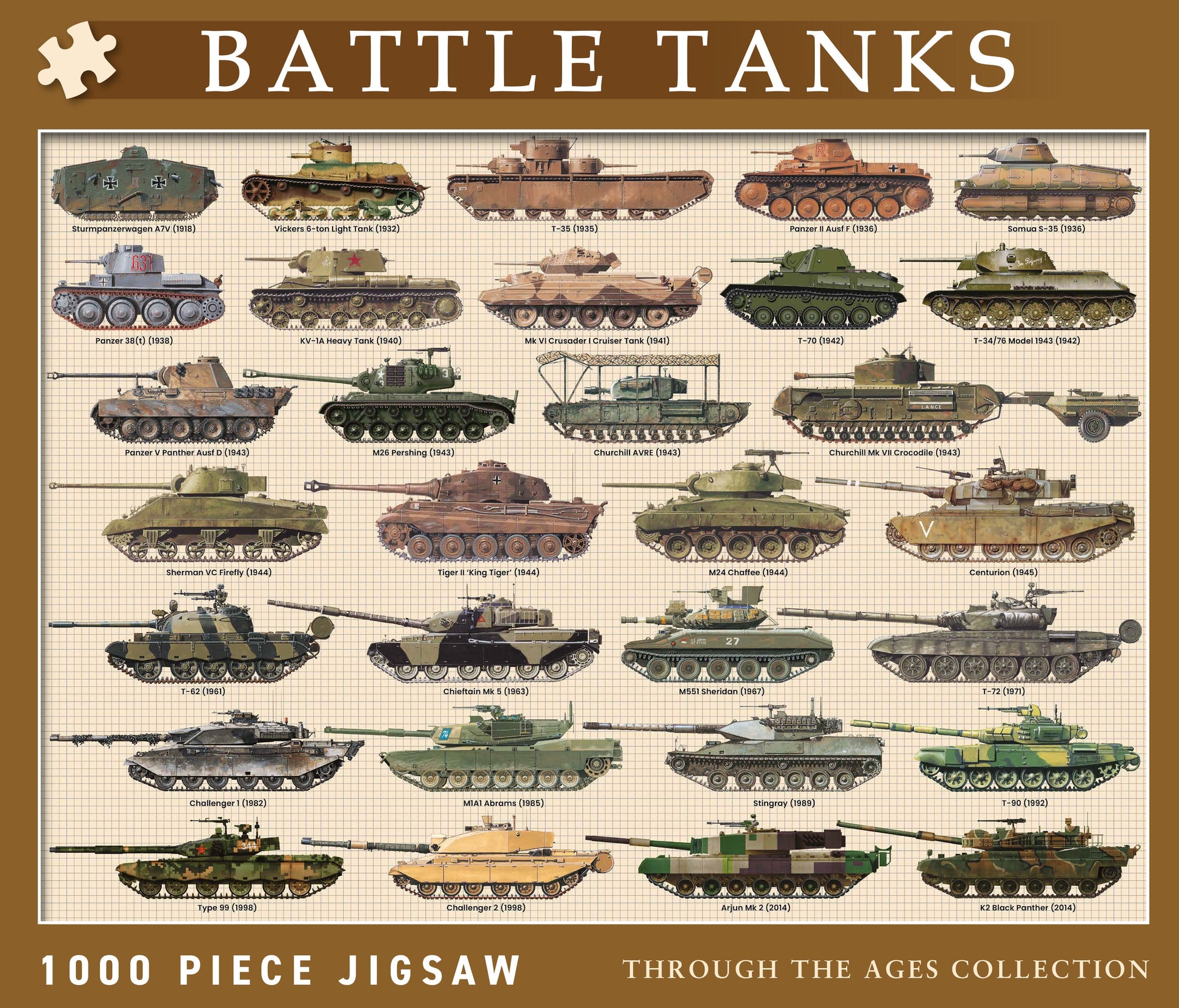 This fascinating jigsaw puzzle features 30 Tanks from WWI through to WWII and modern day tank hard-ware, featuring tanks such as the Sherman and Tiger right though to the modern day Challenger and Abrams that have been bought to life in these stunning illustrations.