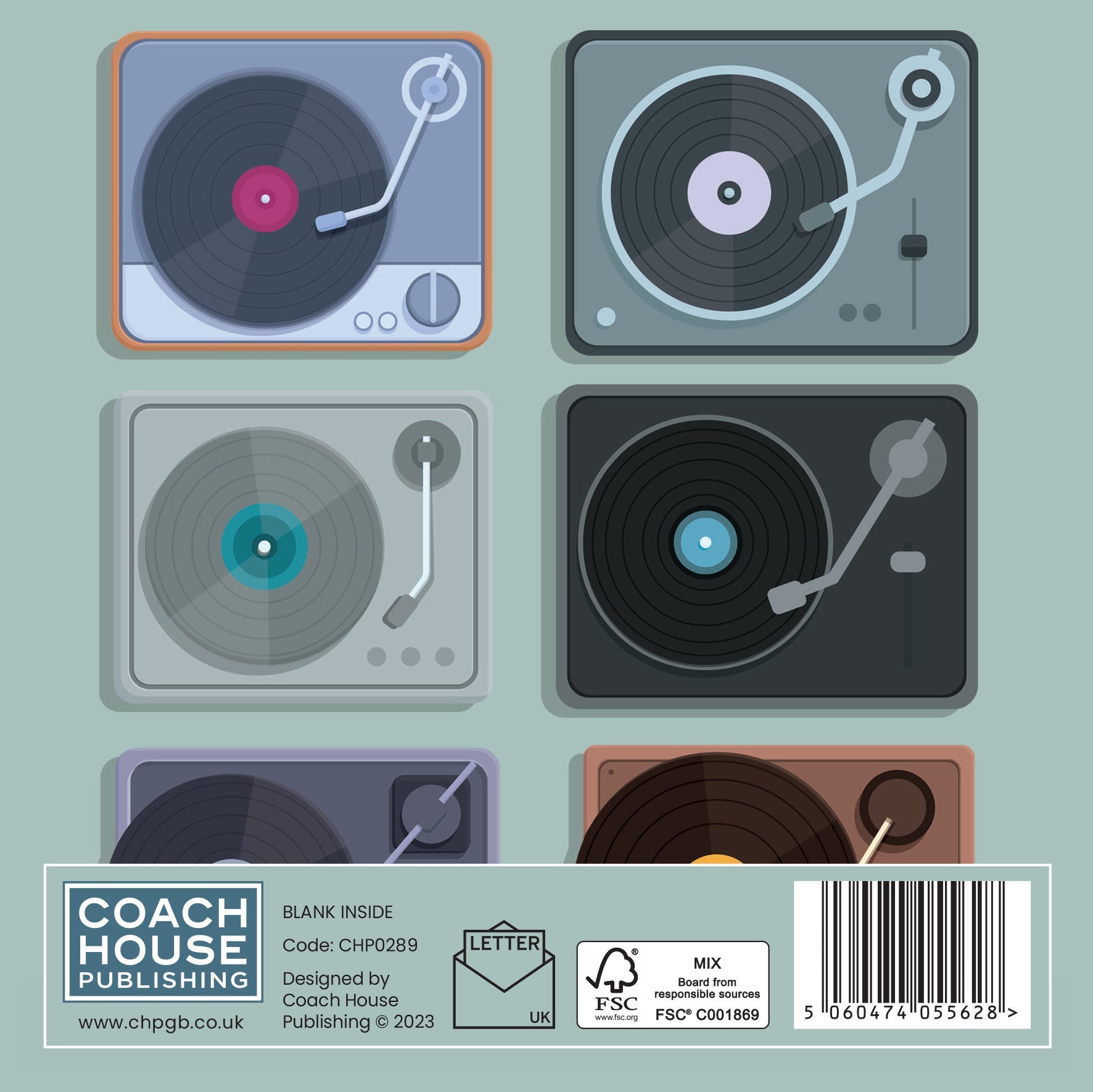 The front and rear cover designs showing a series of carefully illustrated images of Turntables through the ages. The perfect card for Retro and Music Enthusiasts around the world!