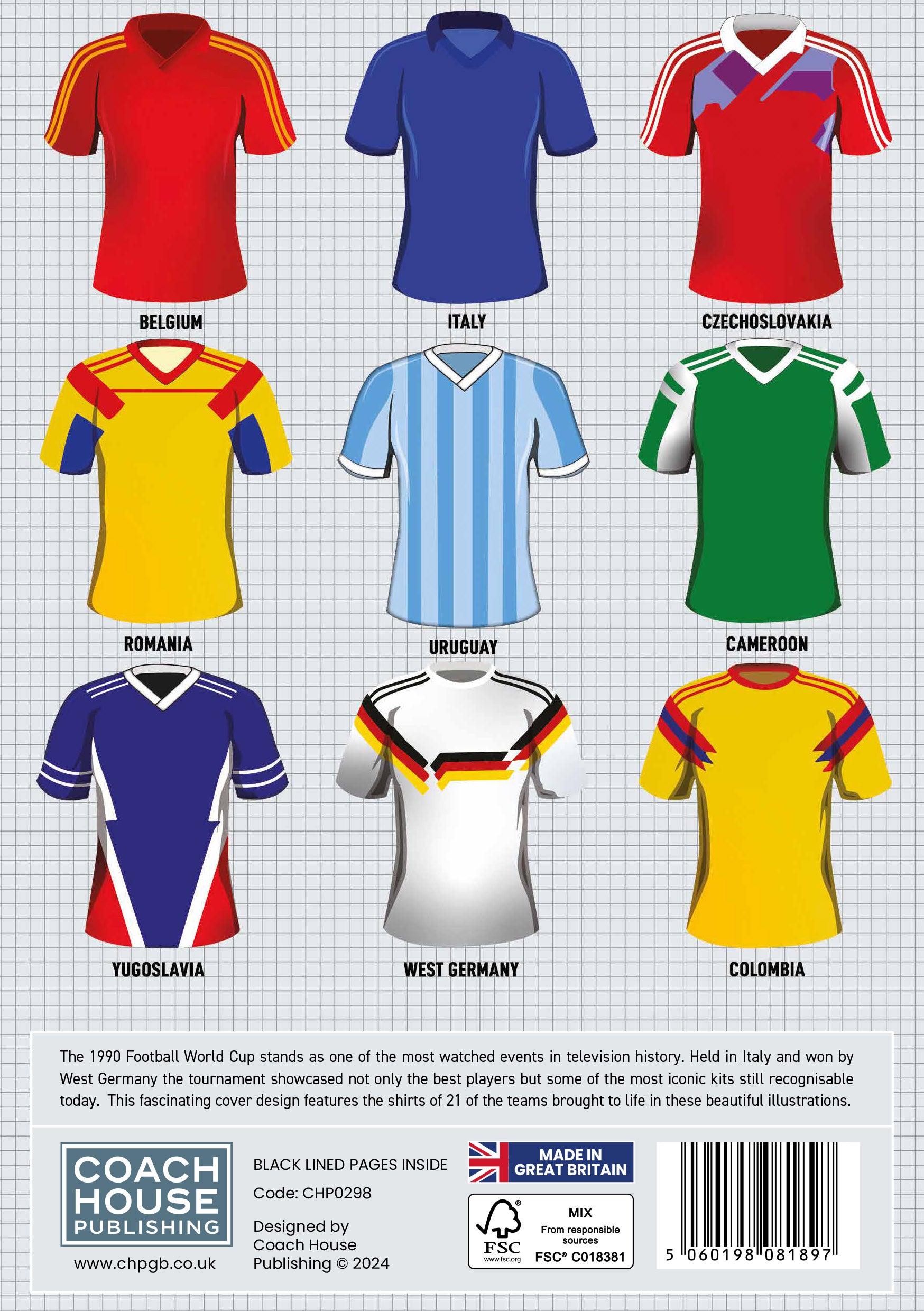 The front and rear cover displays a series of carefully illustrated images of vintage football tops from the 1990 World Cup. The perfect notebook for Sport Enthusiasts around the world!