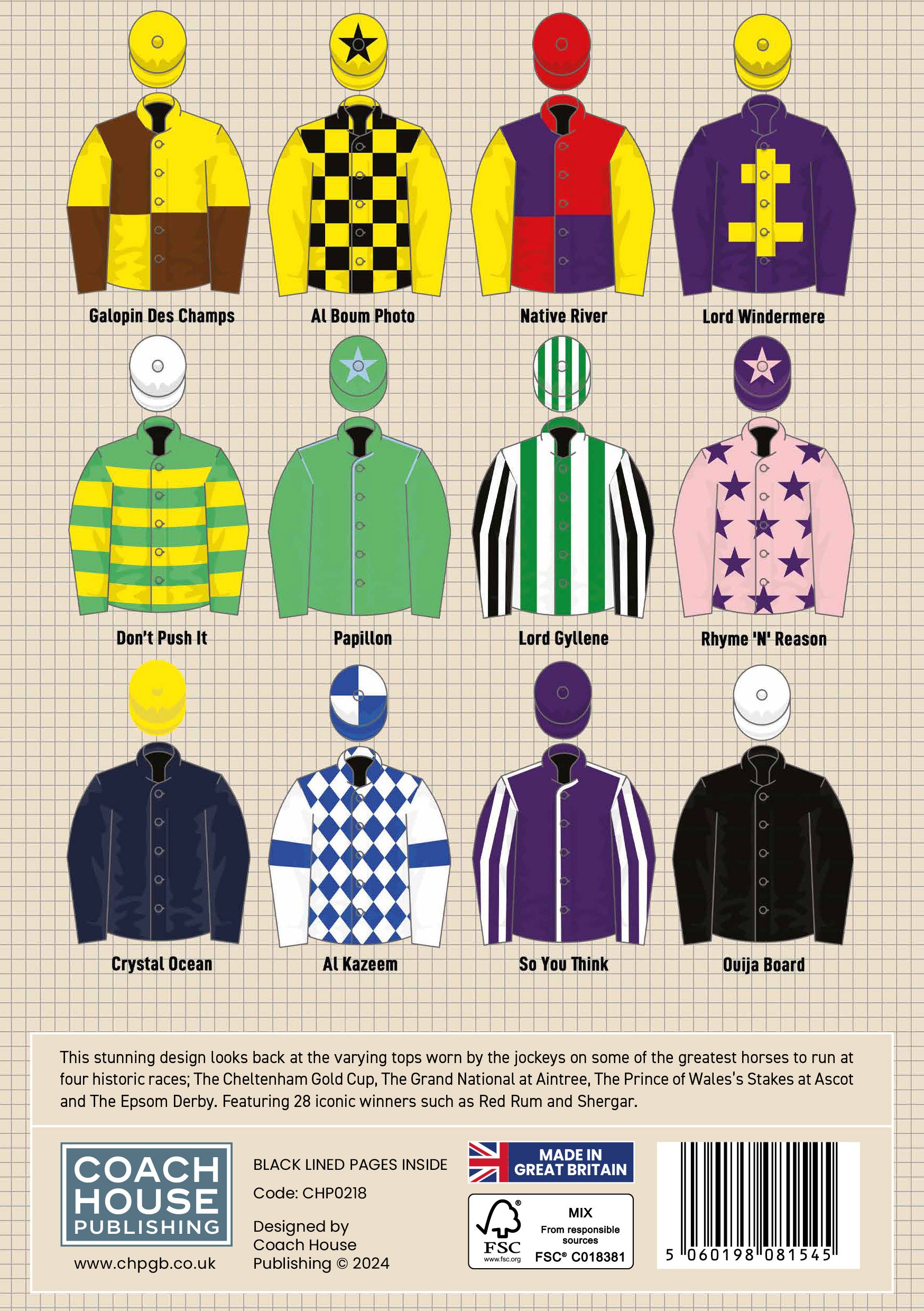 The front and rear cover displays a series of carefully illustrated images of varying tops worn by the jockeys on some of the greatest horses to run at four historic races; The Cheltenham Gold Cup, The Grand National at Aintree, The Prince of Wales’s Stakes at Ascot and The Epsom Derby. The perfect notebook for Horse Racing and Sports Enthusiasts around the world!